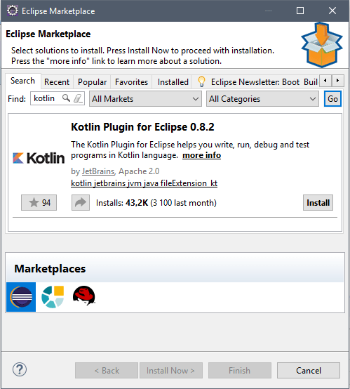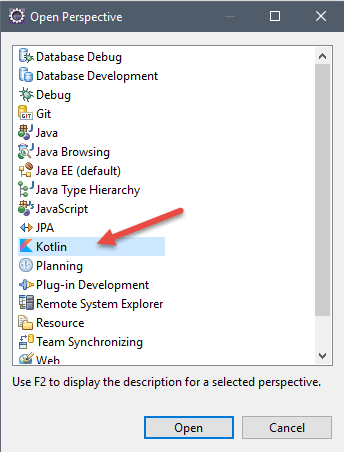 A l’issue de l’installation, Eclipse demande un redémarrage pour finaliser la procédure, nous pouvons vérifier que le plugin Kotlin est correctement installé, en ouvrant la perspective Kotlin dans le menu principal Window -> Open Perspective -> Other...