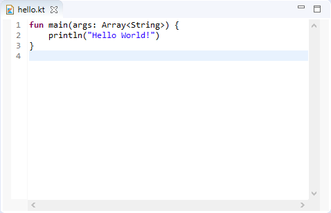 Enfin, nous ajoutons une simple ligne de code Kotlin pour imprimer le message "Hello World!" :