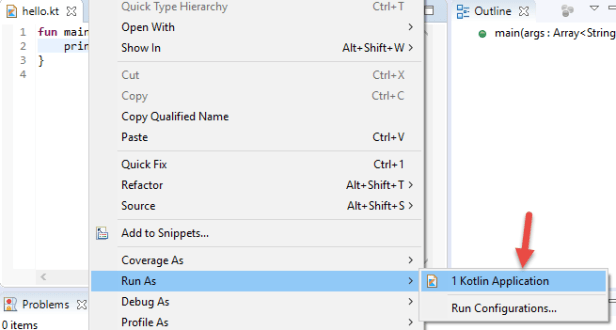 Le moyen le plus simple d'exécuter l'application consiste à faire un clic droit quelque part dans le fichier principal et à sélectionner Run As -> Kotlin Application