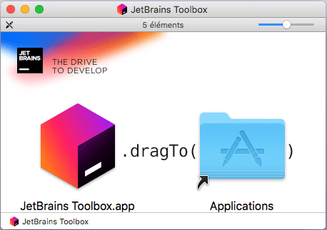 Déplacer l'icône "JetBrains Toolbox" sur l'icône "Applications" pour lancer la procédure d'installation.